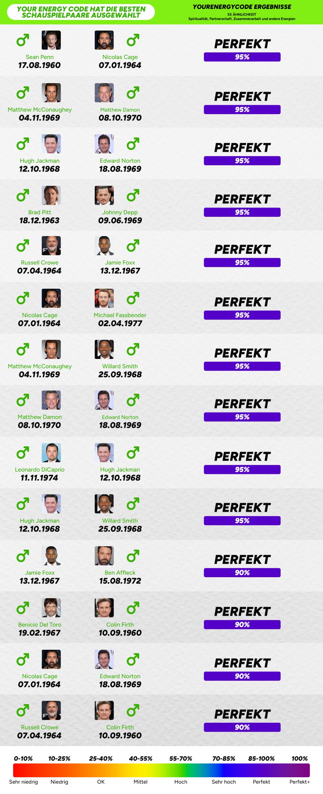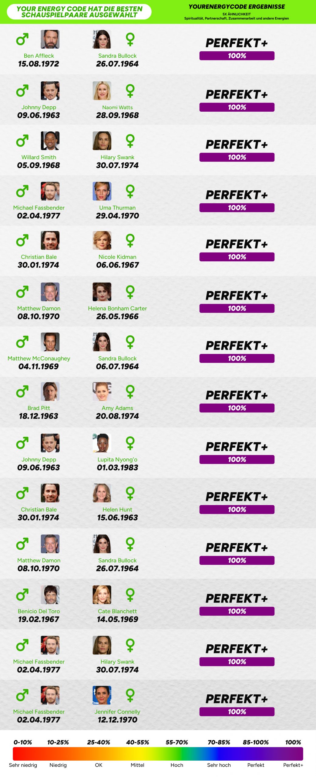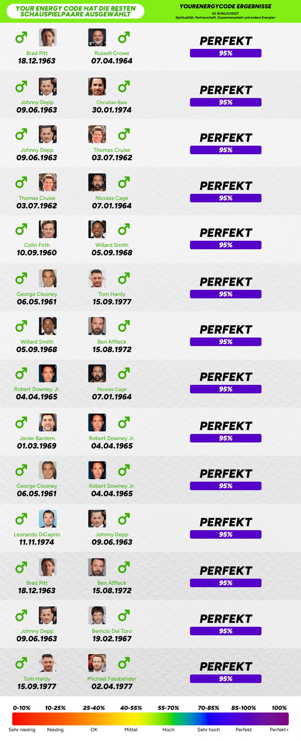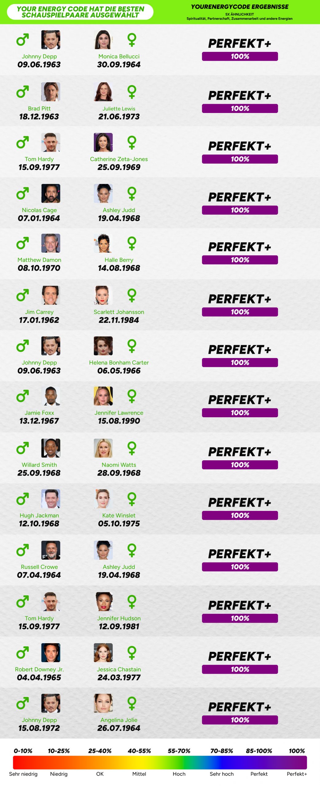 Nachfolgend präsentieren wir die Ergebnisse eines virtuellen Castings von Hollywood-Schauspielerpaaren, die die höchsten Energysynchronizitätswerte (ES) für die folgenden Paar-Konfigurationen erzielt haben: