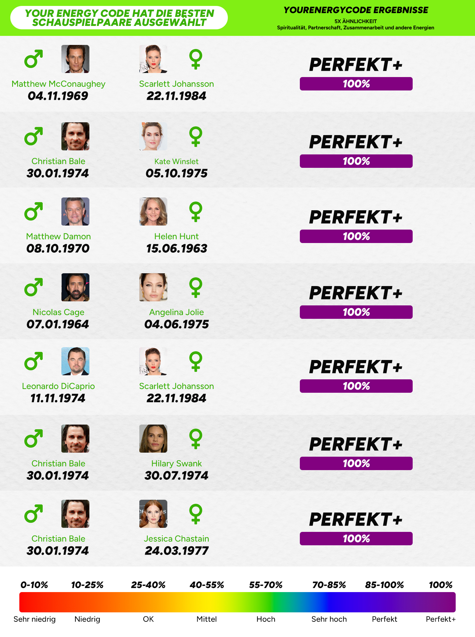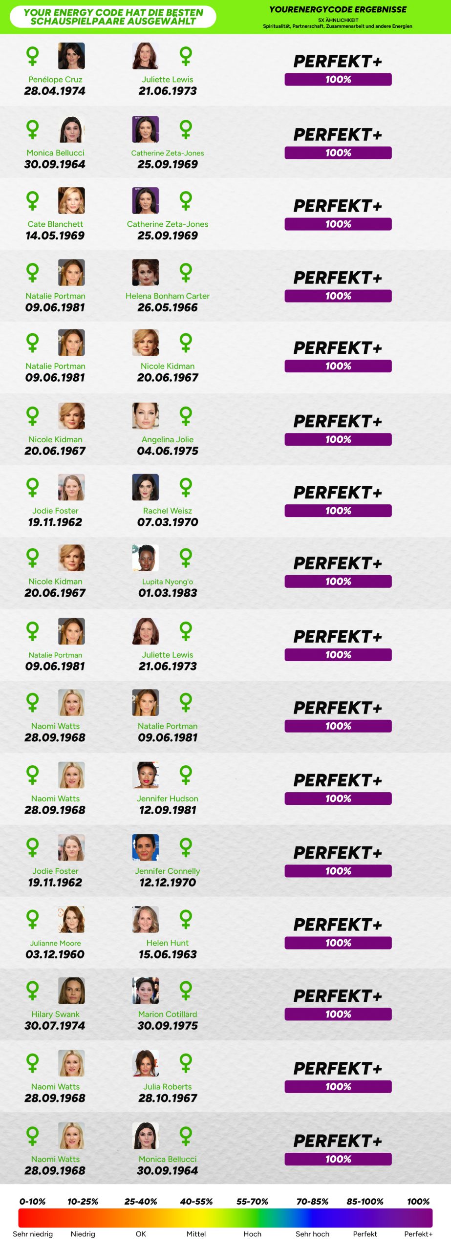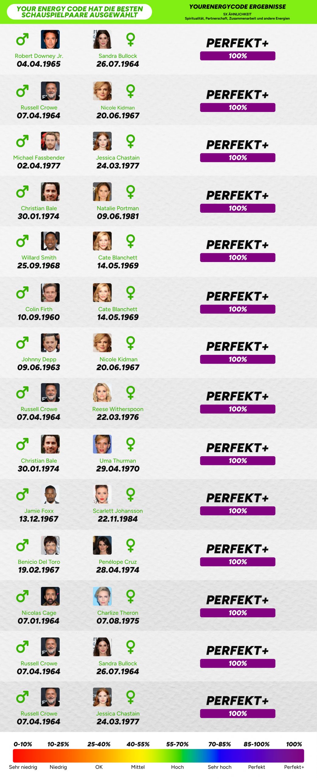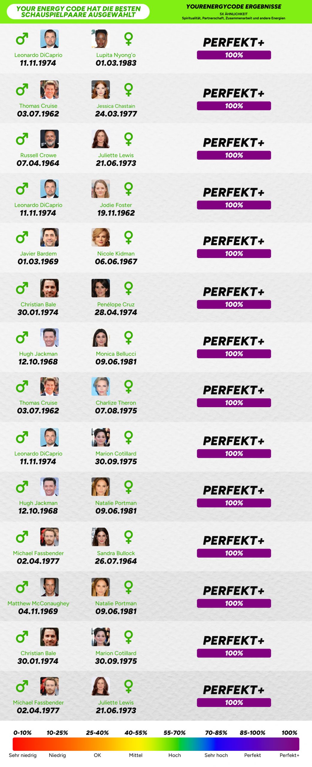 Nachfolgend präsentieren wir die Ergebnisse eines virtuellen Castings von Hollywood-Schauspielerpaaren, die die höchsten Energysynchronizitätswerte (ES) für die folgenden Paar-Konfigurationen erzielt haben: