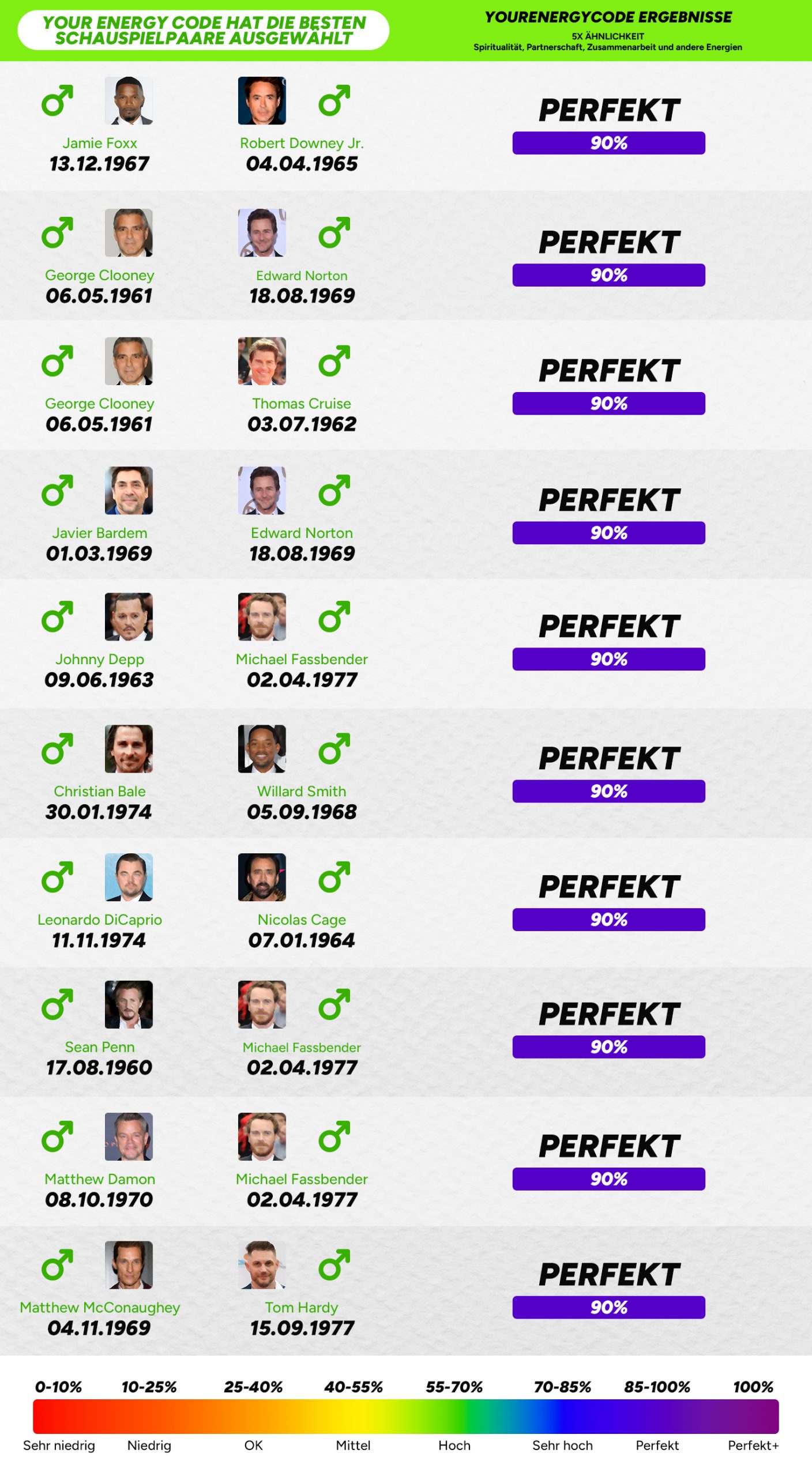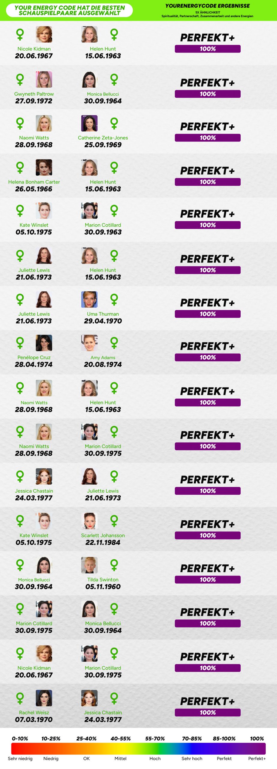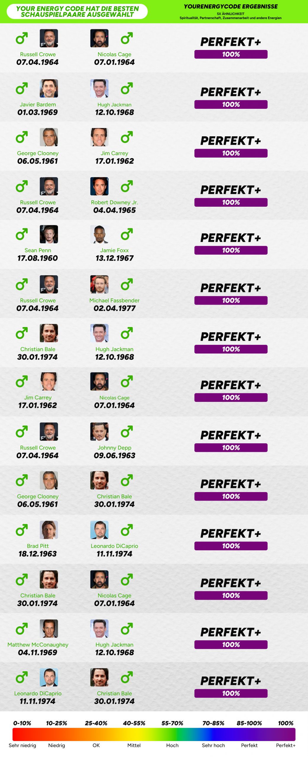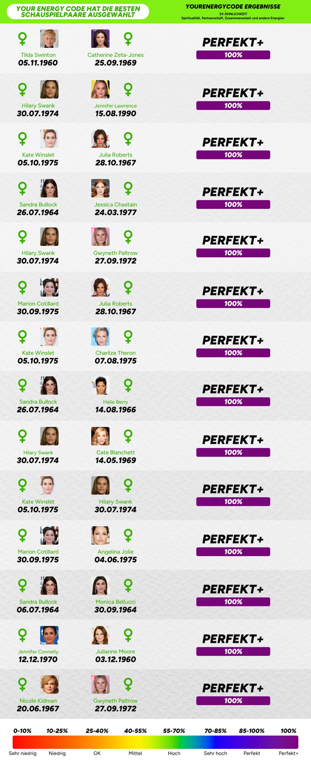 Nachfolgend präsentieren wir die Ergebnisse eines virtuellen Castings von Hollywood-Schauspielerpaaren, die die höchsten Energysynchronizitätswerte (ES) für die folgenden Paar-Konfigurationen erzielt haben: